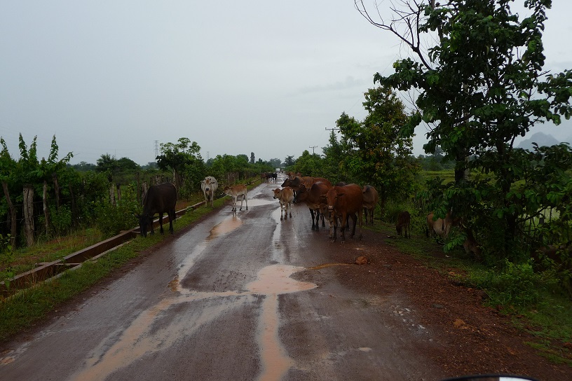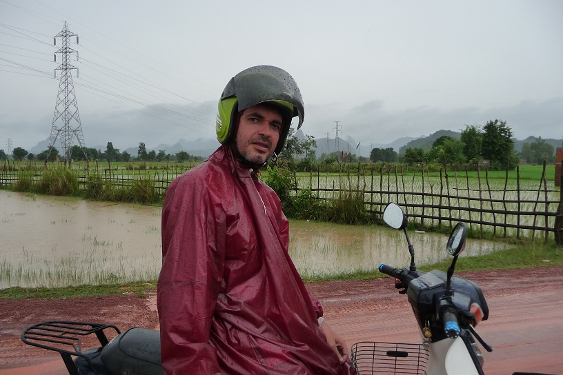 En se réveillant pour la première fois dans notre belle et très grande chambre de Takhek dotée d’une salle de bain aussi grande qu’un terrain de handball, nous ouvrons donc nos volets et tombons sur… De la pluie.