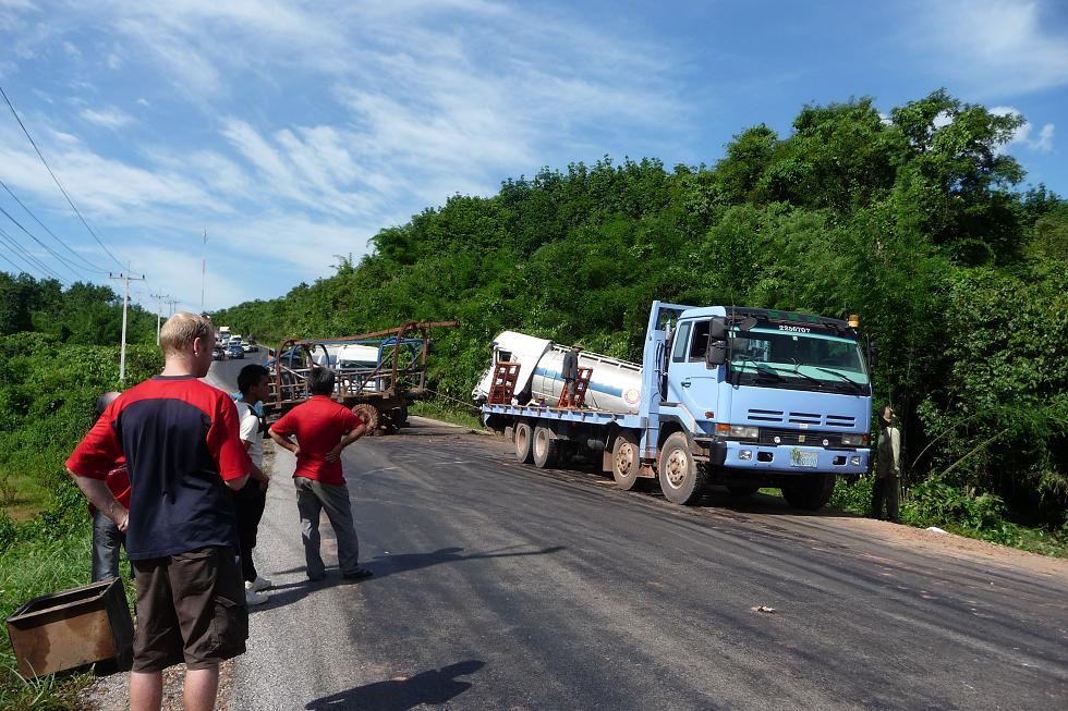 Un camion citerne a freiné dans la descente, et le bitume chauffé par le soleil à décidé de s’enrouler autour des pneus du camion, qui n’a pas pu freiner et s’est vautré lamentablement dans une rizière en bas de la route. Donc la route est barrée… Quand on vous dit qu’il fait chaud c’est pas pour déconner !