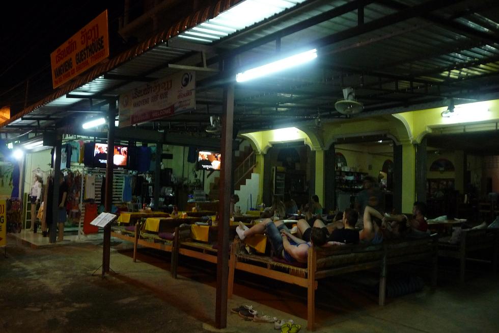 Et à ce titre Vang Vieng est devenue un haut lieu touristique. Si vous ajoutez qu’une rivière permet de descendre, accroché à une bouée, son flot impétueux sur plusieurs kilomètres, vous en déduirez que la population qui l’assaille est principalement jeune : grands ados, jeunes adultes.