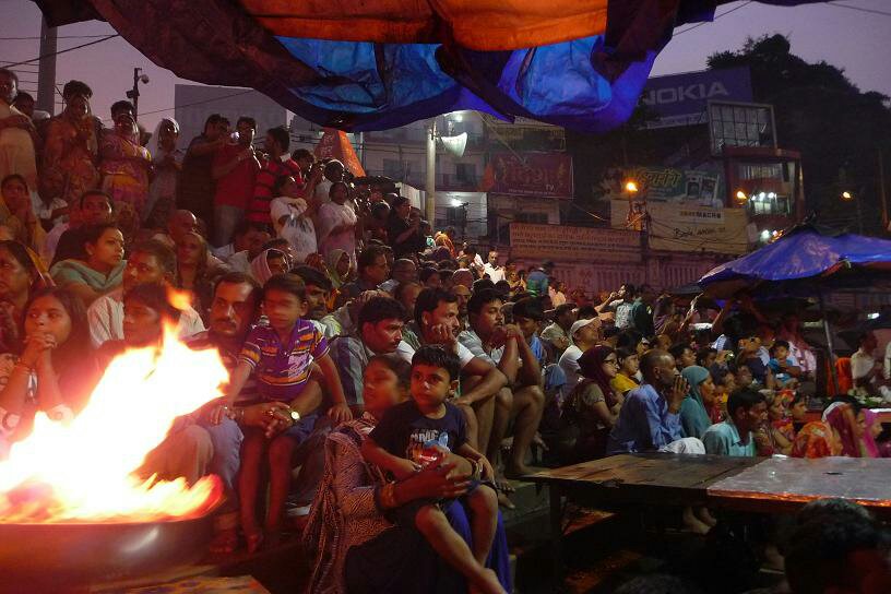 Les croyants s’agglutinent par milliers au bord de l’eau, envoient des offrandes (un petit bateau en feuille de palmier, chargé de pétales de fleurs et d’une bougie) à la mère Ganga, puis se baignent dans le fleuve (démonté par les pluies) en se tenant aux chaînes leur permettant de ne pas se faire emporter par le flot impétueux.