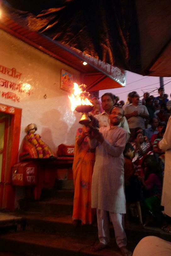 Partout dans le ghât des hommes porteurs de grandes torches enflammées apparaissent, les haut parleurs diffusent maintenant une jolie chanson très spirituelle où il est question de Dieux, de la mère Gange et de feu purificateur, mais dont le sens précis nous échappe hélas un peu.