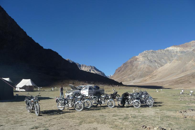 12 rutilantes Enfield, un pick-up chargé d’essence et de pièces, nous voila sauvés.