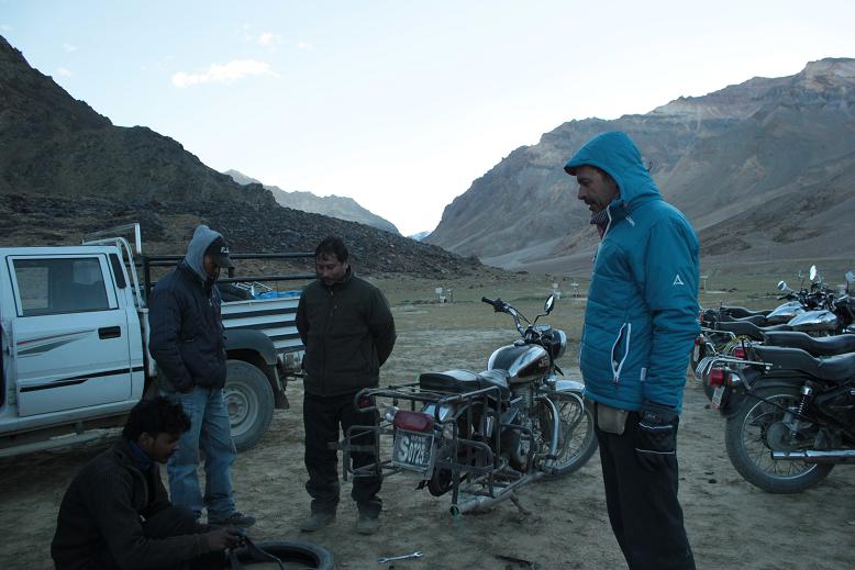 Apres une séance réparation de moto, sous leur regard admiratif mais bougon (nous ne savons pas si c’est le fait qu’on leur pique momentanément leur mécano ou le froid qui fige les visages de tout le monde (nous sommes quand-même a 4300 mètres et le soleil s’est barré derrière les montagnes)).