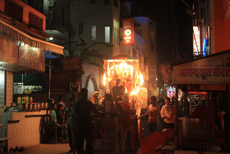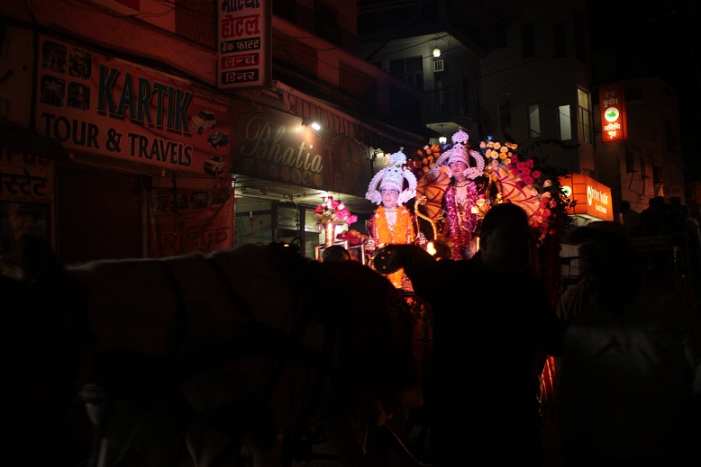 Haridwar, fidèle à elle-même avec ses habitants gentils, et ses fêtes religieuses en permanence. Souvenez-vous nous en sommes partis après une grosse chouille célébrant l’anniv’ de Krishna. Et ce soir là c’est une fête avec fanfares et chars étincelants sillonnant les ruelles de la ville. Une fête pour un Dieu secondaire (ils en ont plusieurs millions rappelez-vous) issu de Brahma.