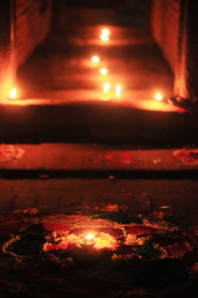 Le matin c’est au tour des vaches d’être chéries, parées de colliers de fleurs et gavées de la meilleure herbe qui soit, afin d’obtenir la prospérité et la santé. Puis la soirée s’annonce et toutes les maisons ornent leurs perrons, bords de fenêtres, terrasses et toit de lampes à huile en l’honneur de la déesse de la santé et la prospérité Laxmi.