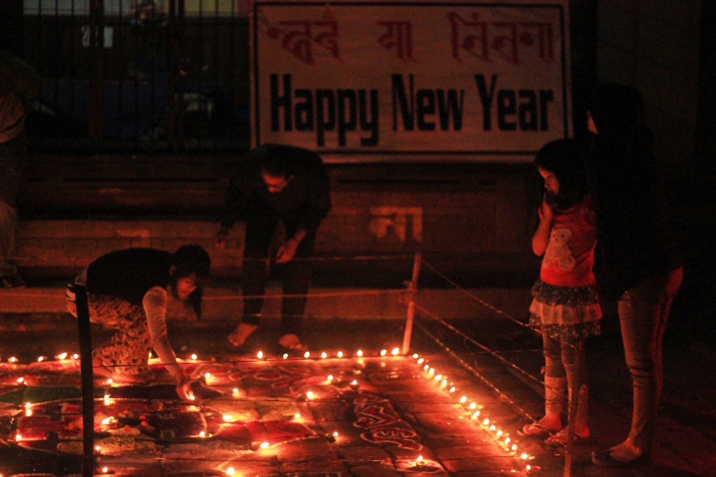 Kathmandu où nous passerons la fin de cette journée de nouvel an, dans une ville elle aussi parée de lumières, animée par des chants d’enfant et des fanfares d’adultes.