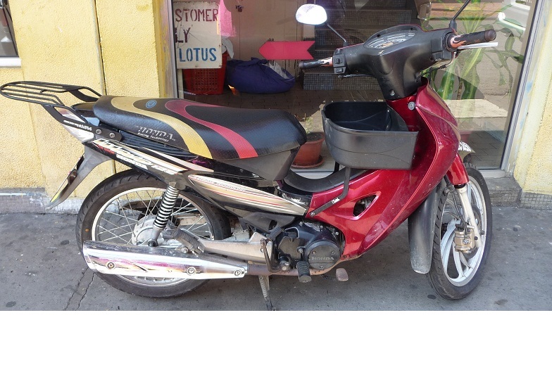 Karadok : Honda Wave 125cc de 2005, 4 temps, boite semi-manuelle (appréciez la subtilité), un peu moins old-school côté look, mais très agréable à conduire. Les vitesses passent toutes seules, c’est un vrai bonheur.